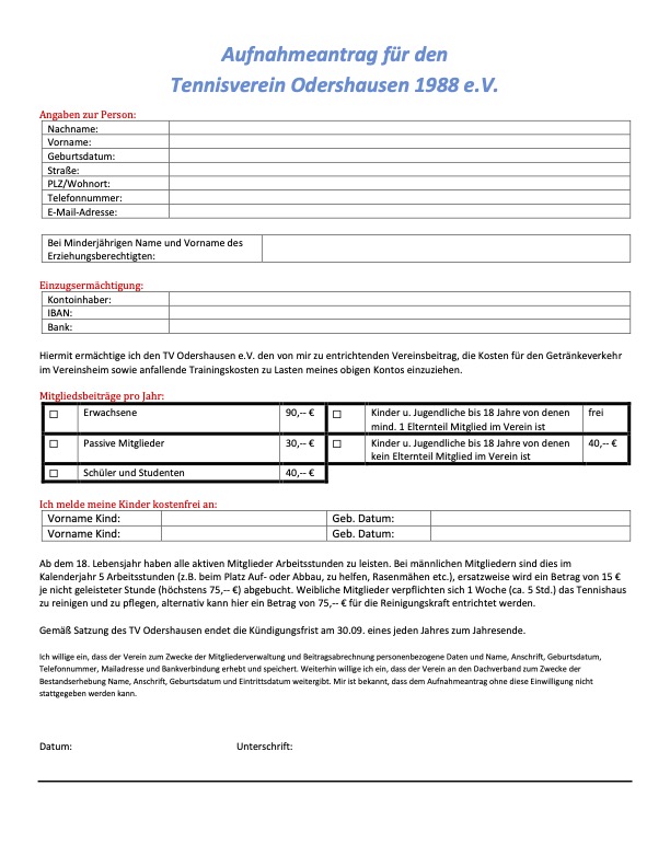 Aufnahmeantrag Mitgliedschaft TV Odershausen
